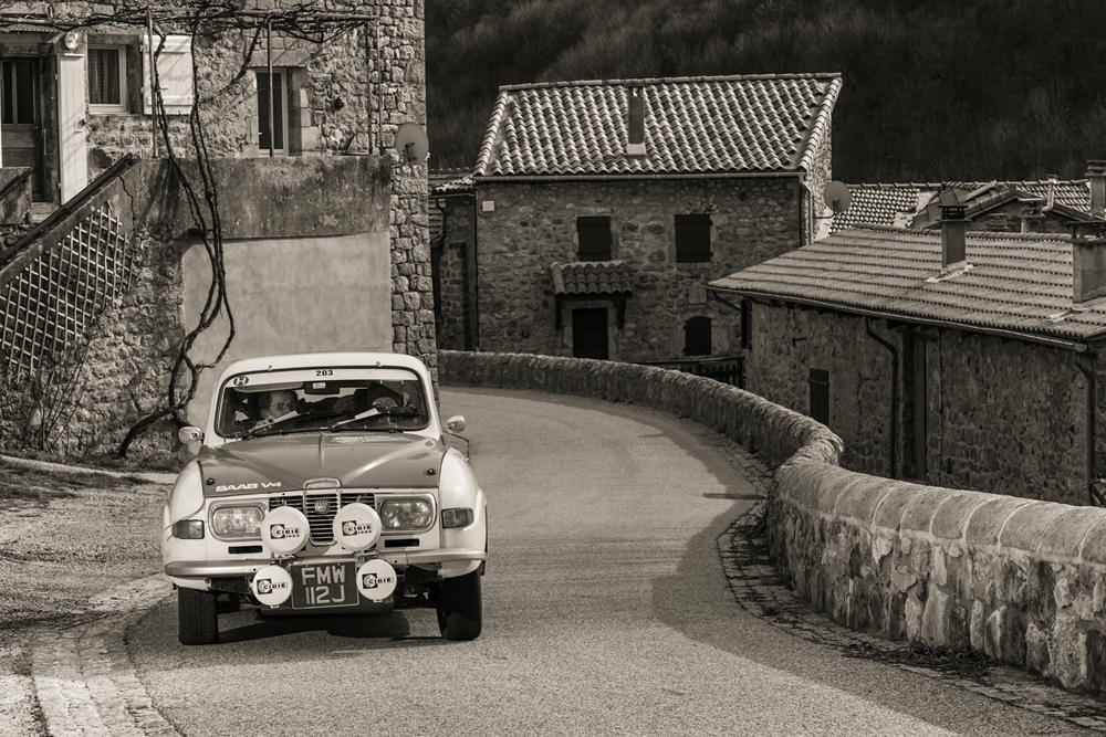 The Saab continued it's journey south through rural France via Time Controls along the route at Town Halls, where the locals were out in force to watch the spectacle and cheer on the drivers. The competitive stages started just south of Grenoble, and then continued over several days in the mountains around Valence, before eventually leading to Monte Carlo.